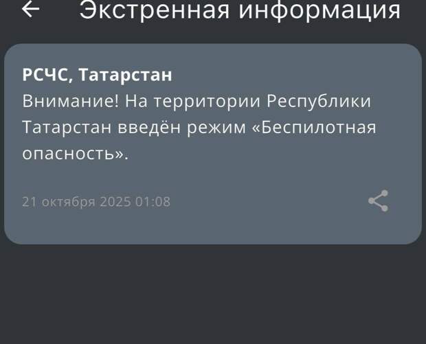 Татарстан территориясендә бүген Мәскәү вакыты белән 01.08 сәгатьтә «пилотсыз куркыныч» режимын керттеләр. Бу хакта Россия Гадәттән тыш хәлләр министрлыгының мобиль кушымтасында хәбәр иттеләр.